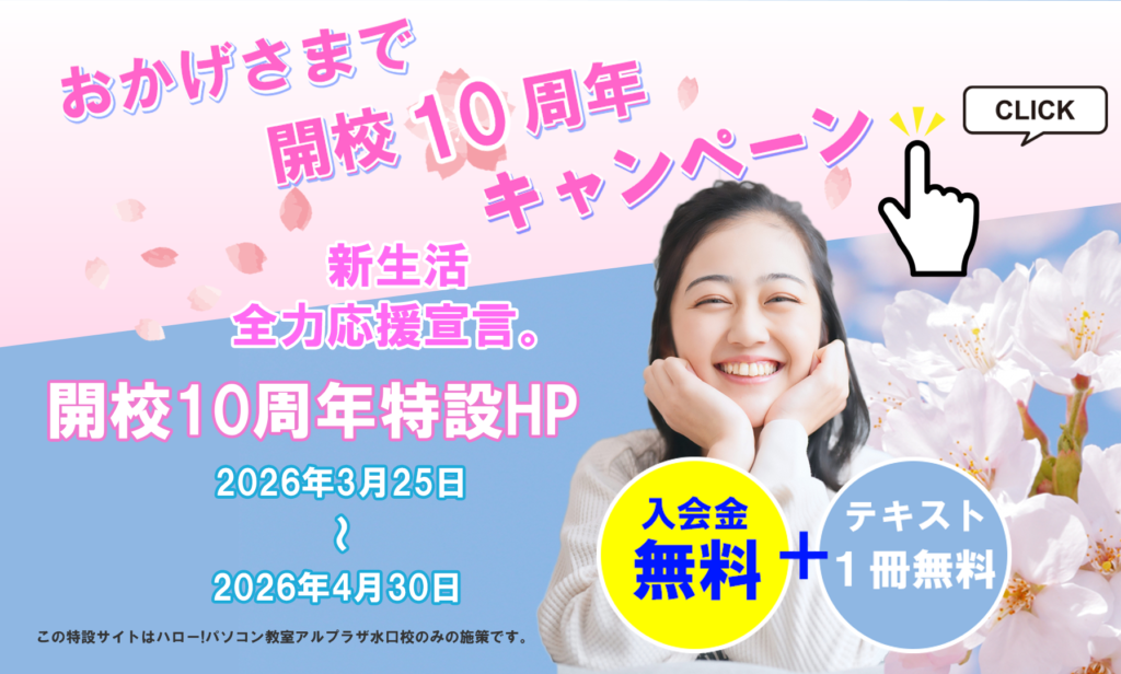 甲賀市のパソコン教室ってどう? ハロー!パソコン教室アルプラザ水口校が2026年3月で10周年を迎えました。 地域の皆様に支えていただきここまでやって来られたこ