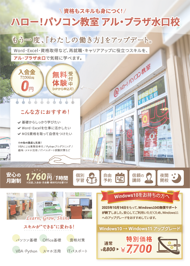 Word,Excelの基本はもちろん、MOS(マイクロソフトオフィススペシャリスト)、VBAやPythonなどのプログラミングもご好評いただいており、お仕事で活用されている方も増えています。
