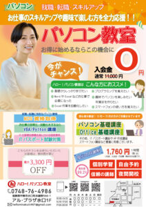 キャンペーン 入会金50%OFFキャンペーン10月末まで! アル・プラザ水口校 ホーム 教室・助成金案内 講座紹介 office講座 MOS(Microsoft Office Specialist)講座 エクセルVBA講座 パソコン基礎講座 HP/SNS講座 続きを読む» 2025年10月1日
